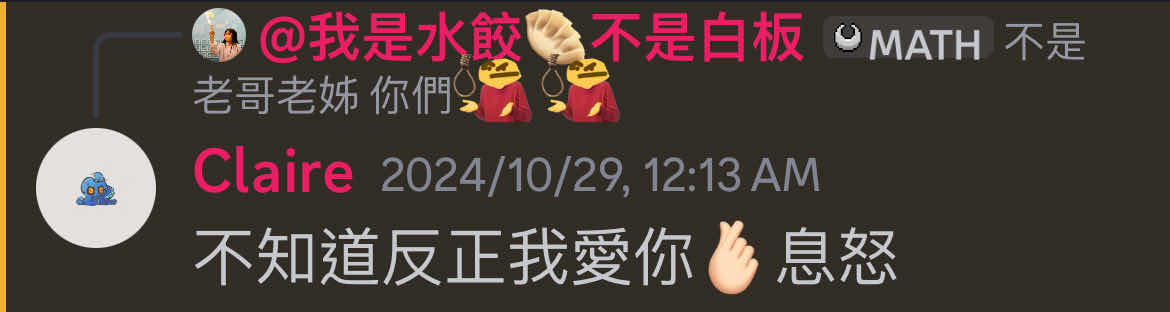 如果你看完以上的文字,恭喜你成功浪費了兩分鐘,也恭喜你沒有被奇怪的題敘嚇跑。從以上的文字應該能看出學長姐對你們滿滿的關愛,那作為回報,同時安慰受傷的水餃,你們也跟兼備電子的長姐們打個招呼吧,請你們輸出 Hello, 2025 CKEFGISC summer camp!