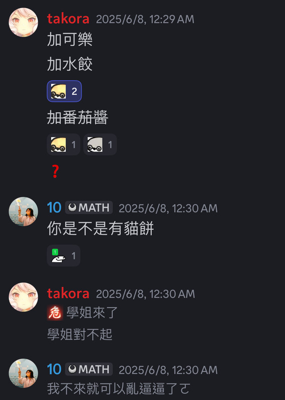 溫莎貓想要確定貓餅可不可以被兩人平分,所以他要判斷n是奇數還是偶數,但他因為昨晚在寫社網(沒錯貓咪會寫社網),腦袋燒了而沒辦法思考;而水餃e0只是顆水餃,自然沒辦法理解太過於數學的難題;至於takora滿腦子只想著貓餅適不適合沾番茄醬,也陷入了自身的大腦風暴中。
